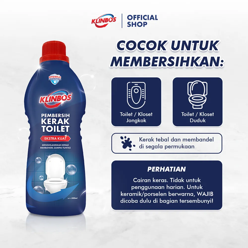 (KLINBOS PEMBERSIH KERAK TOILET – pembersih yang diformulasikan “Ekstra Kuat” untuk menghancurkan kerak dan noda paling membandel pada toilet. Dilengkapi dengan Hygienic Protection yang membantu melawan bakteri penyebab bau dan menjaga permukaan tetap higienis lebih lama. Membersihkan kerak akan menjadi lebih cepat dan mudah tanpa mengeluarkan banyak tenaga)